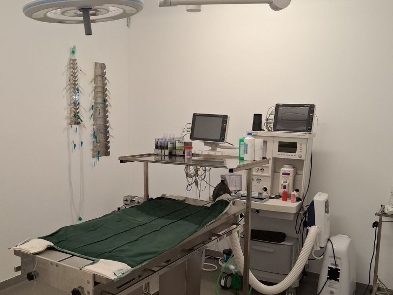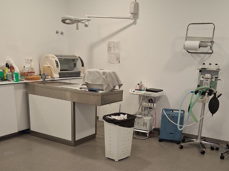 Sala de cirurgia totalmente equipada, com aparelho de anestesia volátil, equipamento cirúrgico moderno e uma equipa de cirurgiões veterinários, que nos permite realizar qualquer cirurgia, desde as mais simples suturas de feridas às cirurgias gastro-intestinais, urológicas, de tumores, etc.